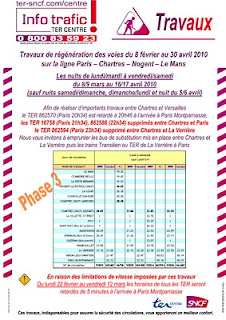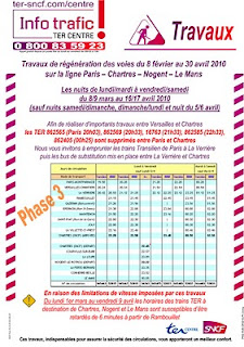 A titre d’exemple, pour les habitués du 20h03, il faudra partir de Montparnasse à 19h58 par le Transilien, prendre un bus à La Verrière pour une arrivée à Rambouillet à 21h10 (20h34 en temps ordinaire), arrivée à Chartres à 22h28 (21h13 d’habitude…).