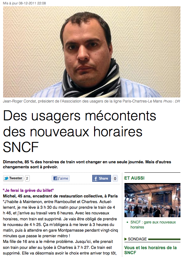 Posted on 9 décembre 2011 by Paris-Chartres Article du quotidien gratuit Metro concernant la ligne http://www.metrofrance.com/info/des-usagers-mecontents-des-nouveaux-horaires-sncf/mklh!pnwR9fTT9sXVY/