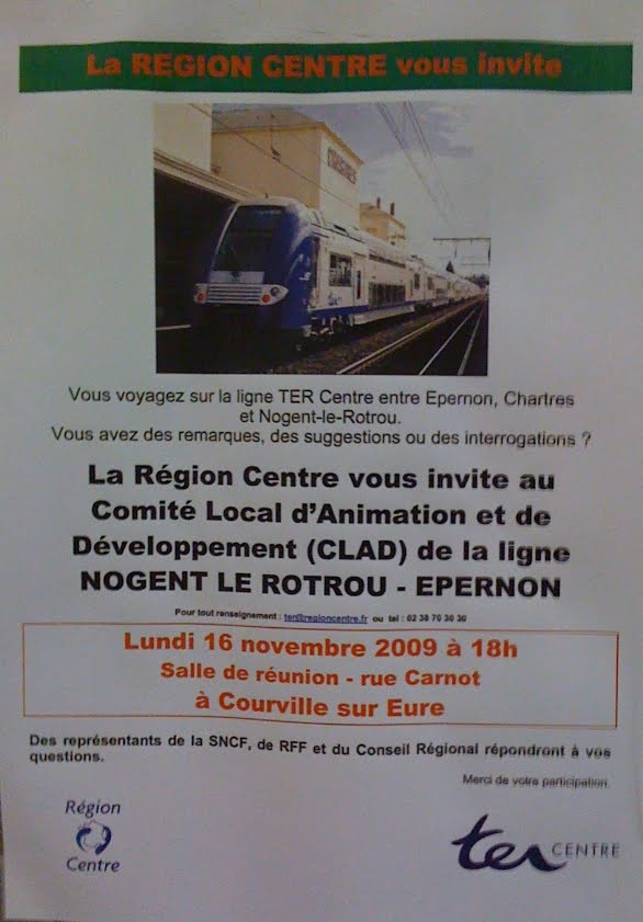 Ce soir, les utilisateurs de la ligne TER sont conviés à se réunir à Courville afin de rencontrer les représentant de la Région Centre afin d’exprimer leurs interrogations, leurs remarques, voire leur colère au sujet de nos trains.