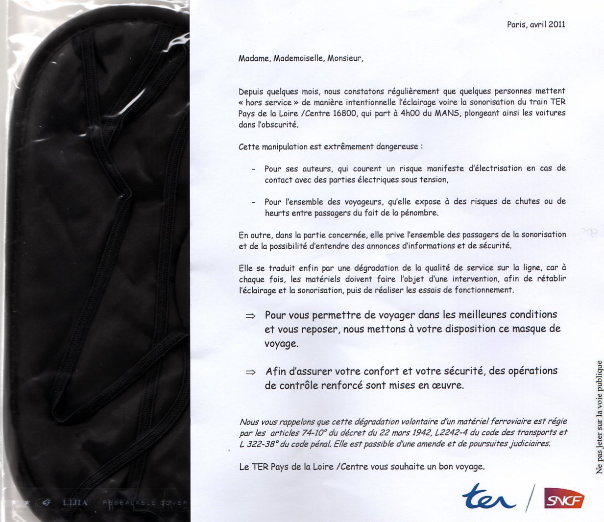 Distribution par la SNCF de masques (pour dormir) sur le 16800 ( 4h du matin au départ du Mans) le 12 Avril 2011