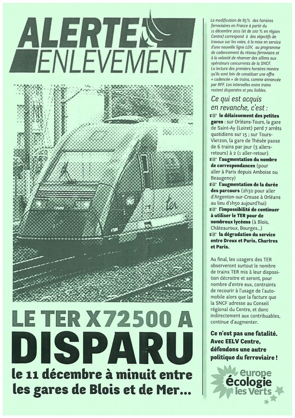 Ce matin en gare d’Epernon, Europe Ecologie Les Verts distribuent des tracts concernant les nouveaux horaires et donc l’allongement du temps de parcours des TER Centre.