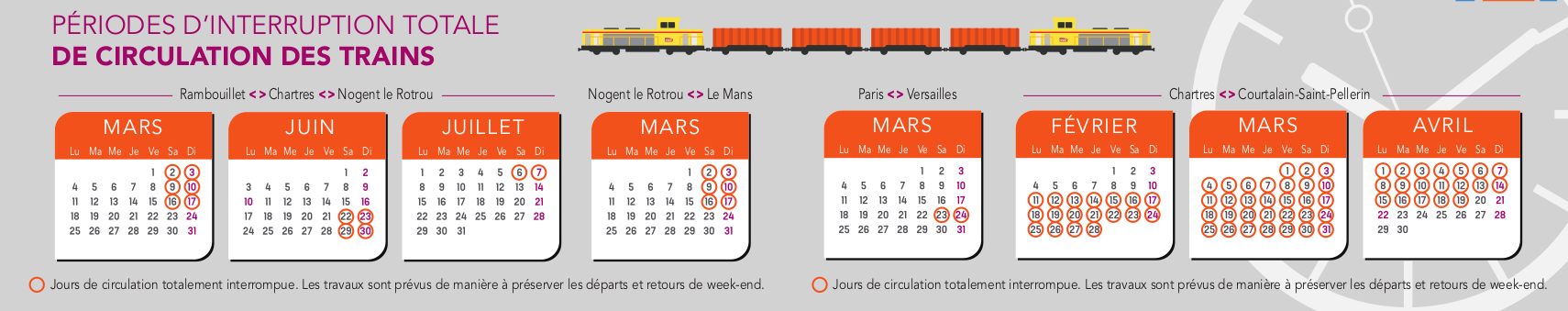 Pour permettre la modernisation des installations et garantir un service performant à long terme, SNCF Réseau procède à de nombreux travaux de renouvellement des équipements de la voie. Près de 200 millions d’euros seront investis en 2019 sur toute la région. Les travaux sont programmés pour permettre aux voyageurs du quotidien de se déplacer : les trains sont préservés aux heures de pointe. Pour assurer les opérations de maintenance complexes, la circulation des trains pourra être suspendue durant 24 à 48 heures lors de certains week-ends ou « ponts ».