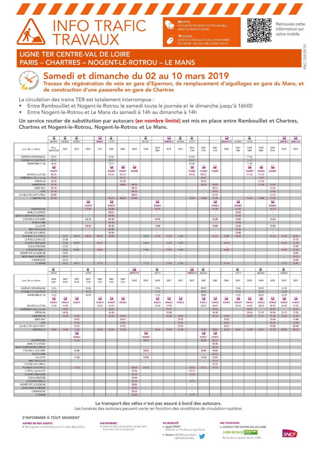 Des travaux de régénération de voie en gare d’Epernon, de remplacement d’aiguillages en gare du Mans, et de construction d’une passerelle en gare de Chartres auront lieu les samedis 02/03/2019 et 09/03/2019 ainsi que les dimanches 03/03/2019 et 10/03/2019