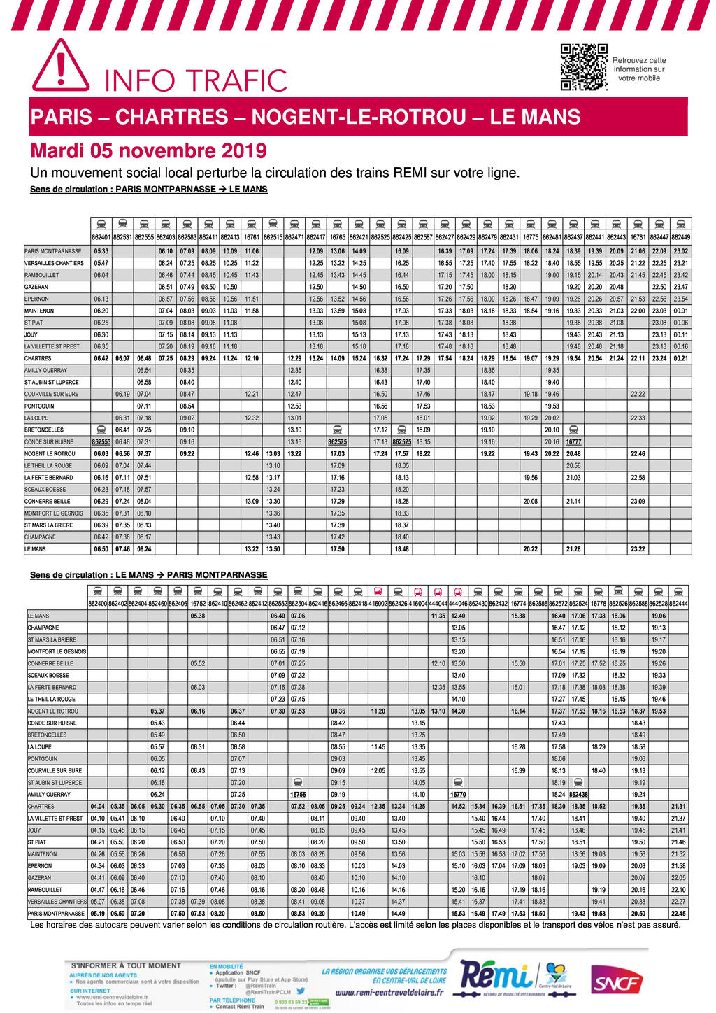 Voici les horaires des trains REMI pour la journée du mardi 05 novembre 2019 :