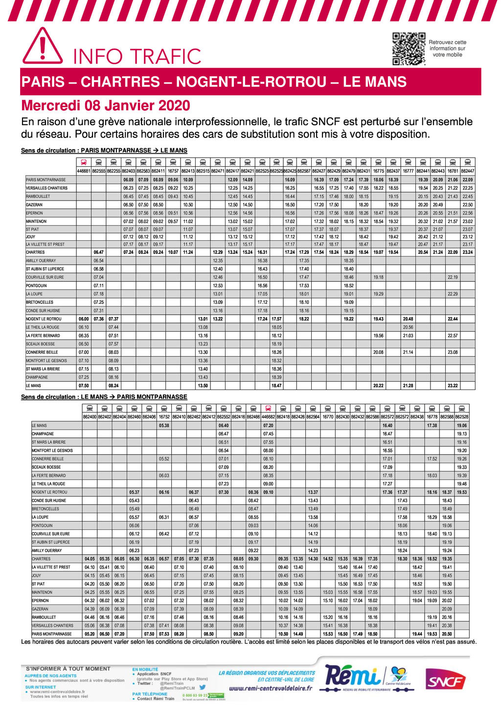 Voici le plan de transport prévu de la ligne PCLM pour la journée du mercredi 08 janvier 2020