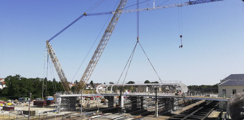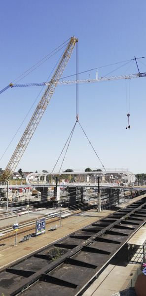 Nous sommes passés jeter un oeil rapidement aux travaux actuellement en gare de Chartres concernant la pose de la passerelle. Un petit balai de grue devant des spectateurs assez impressionnés et il y a de quoi. Un tel travail sous une chaleur de 38°C (à midi) est très impressionnant. Sachant que la semaine a été sous couvert de canicule