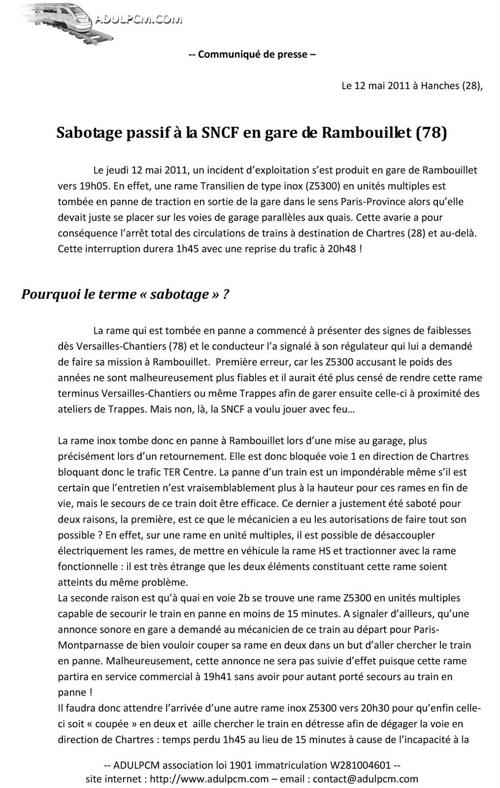 Vous trouverez ci-joint un communiqué de presse dénonçant un acte de sabotage passif de la part de la SNCF et de son incapacité à résoudre les problèmes dans des temps raisonnables. Ce jour, un train est tombé en panne, la situation permettait un secours rapide et efficace, mais la SNCF a fait le choix de ne pas prendre de décision et faire « traîner » les choses pour au final mettre tous les trains TER Centre à un retard allant de 1h à 1h45 ! Ce communiqué de presse explicite concrètement ce qui s’est passé ce jour en gare de Rambouillet (78).