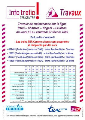 Posted on 30 janvier 2009 by Paris-Chartres Travaux de maintenance sur la ligne Paris – Chartres du lundi 16 au vendredi 27 février 2009 Attention travaux importants engendrant la suppression de plusieurs trains entre Rambouillet et Chartres.