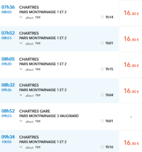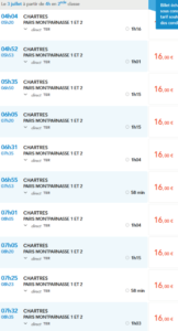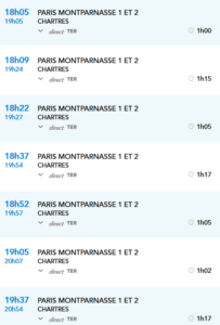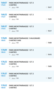 Sur le site www.voyages-sncf.com/on peut trouver les horaires pour Paris-Chartres à partir du 1er juillet prochain et…Il semble que la SNCF se décide à réduire un petit peu nos temps de trajet. Les trains partiraient de 1 à 5mn plus tard de Chartres: Même chose pour le retour, avec une arrivée un peu plus tôt à Chartres: